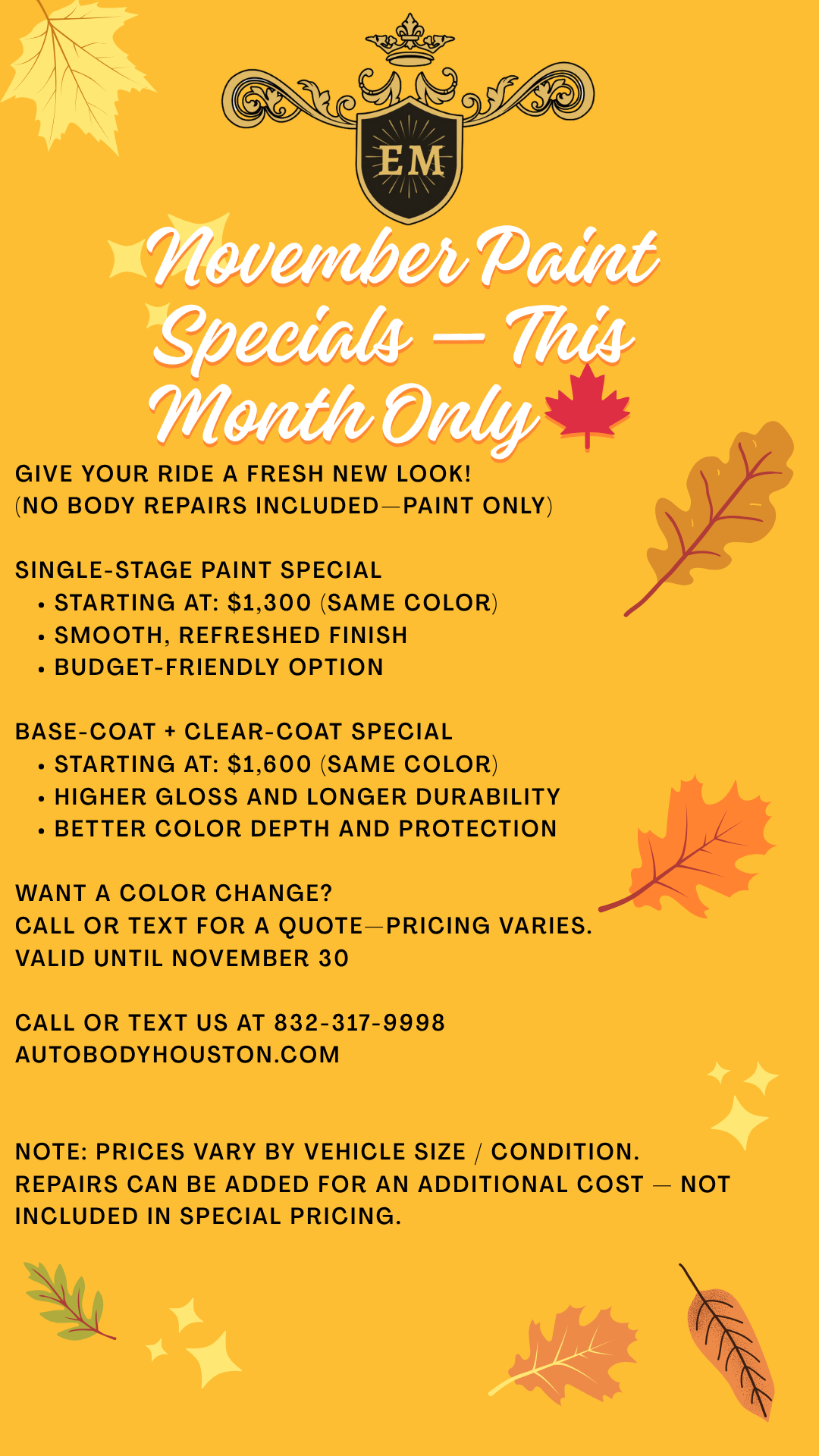 For a limited time, take advantage of our November Paint Specials — featuring professional single-stage and base-coat + clear-coat paint packages starting at just $1,300.